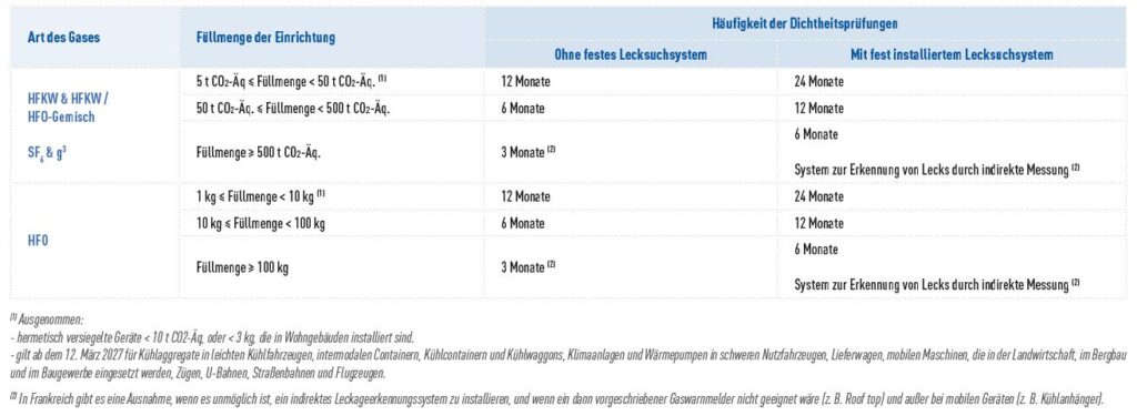 Alle Anlagen mit einer Füllmenge von mindestens 5 t CO2-Äquivalent HFKW und HFKW/HFKW-Gemisch oder 1 kg HFKW müssen einer Dichtheitskontrolle unterzogen werden. Siehe die Tabelle mit den Kontrollintervallen unten.