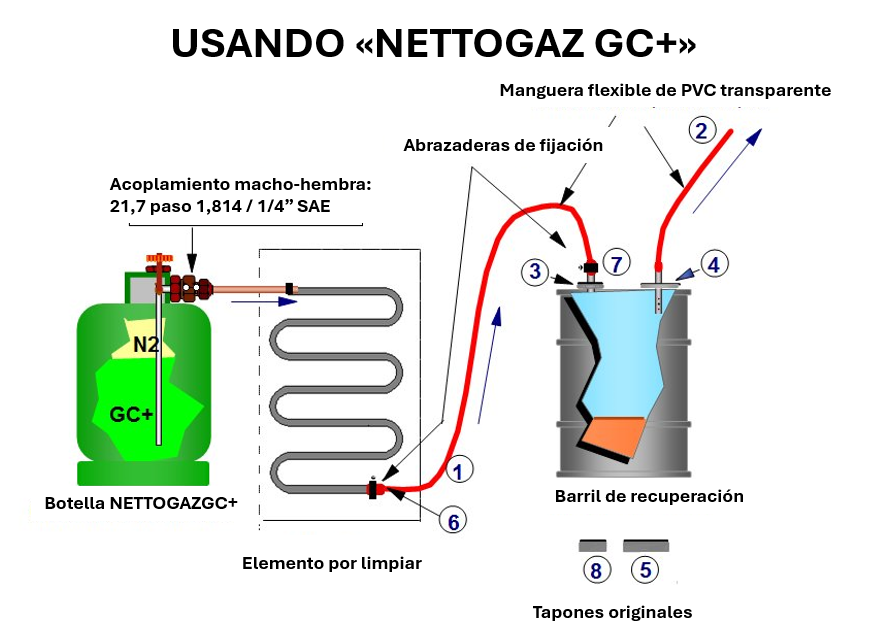 El NETTOGAZ GC+ es la solución ideal para la limpieza interna de circuitos frigoríficos de refrigeración y climatización de pequeño volumen. Es necesario limpiar antes de poner en marcha una instalación nueva y después de una avería que haya provocado la contaminación del circuito. La deshidratación se realiza mediante un vaciado con una bomba. Si hay agua en el circuito, se debe realizar un barrido con nitrógeno antes de la limpieza con GC+.