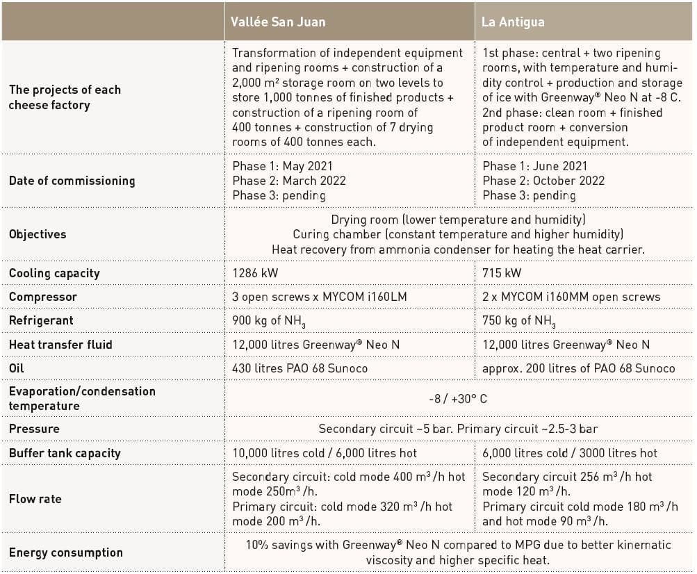 The difference between the two installations, apart from the net volume (see table below), is that “La Antigua” has installed a controlled ice maker and ice reserve that supplies the plant with cold water at +1.5°C every day of production. The ice generator is equipped with a coil regulated with Greenway® Neo N heat transfer fluid at -8°C, which contributes to the general economy of the installation in two ways: