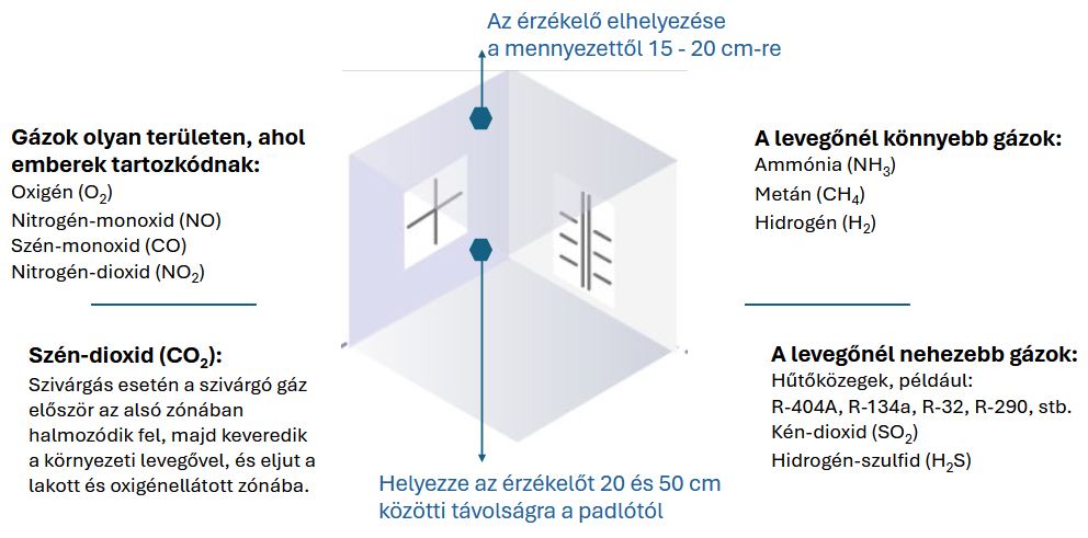 - Az érzékelendő hűtőközeg jellemzői a telepítési magasság meghatározásához.
