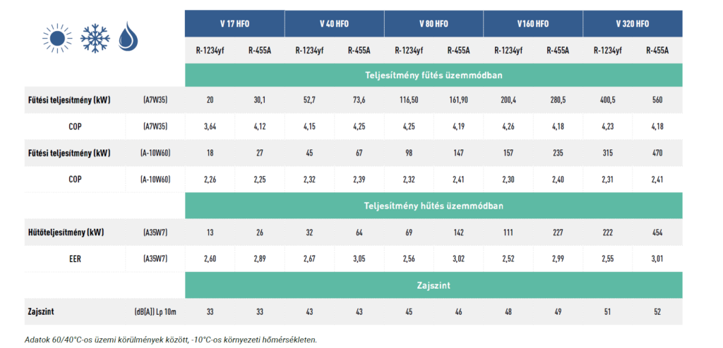 R-1234yf-re vagy R-455A-ra optimalizált hőszivattyúk a kívánt teljesítmény és az elvárt vízhőmérséklet függvényében.