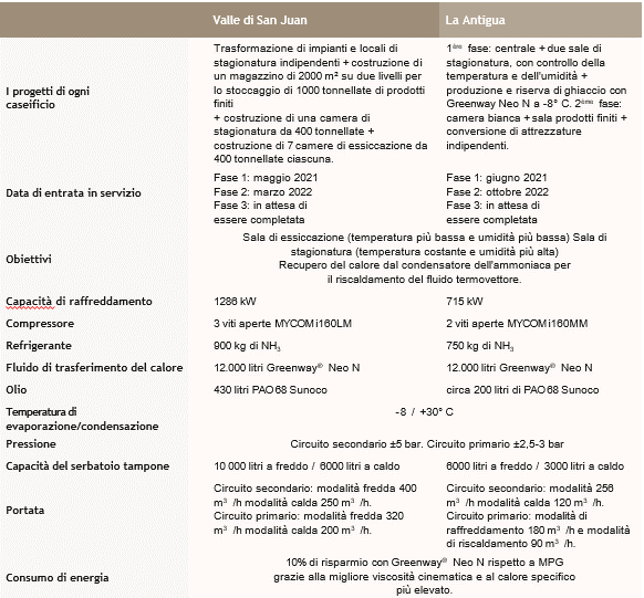 La differenza tra i due impianti, oltre al volume netto (vedi tabella sotto), è che “La Antigua” ha installato un fabbricatore di ghiaccio ad accumulo controllato che fornisce all’impianto acqua fredda a +1,5°C ogni giorno di produzione. Il fabbricatore di ghiaccio è dotato di una serpentina regolata con fluido termovettore Greenway® Neo N a -8 °C, che contribuisce all’economia complessiva dell’impianto in due modi: