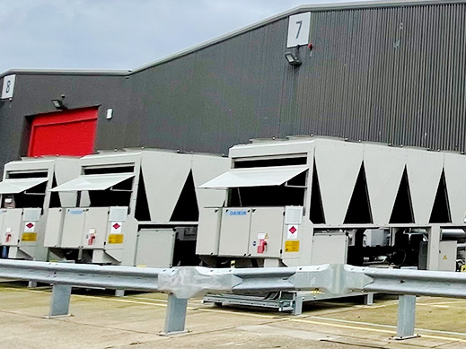 To replace the old units, dry coolers from Kelvion were selected to meet both operational requirements and the customer’s sustainability goals. Three Daikin liquid chillers were also installed and charged with 57 kg of R-32.